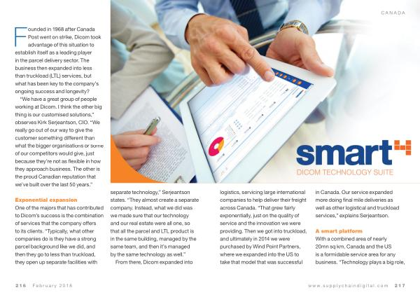 CANADA logistics , servicing large international companies to help deliver their freight across Canada . “ That grew fairly exponentially , just on the quality of service and the innovation we were providing . Then we got into truckload , and ultimately in 2014 we were purchased by Wind Point Partners , where we expanded into the US to take that model that was successful in Canada . Our service expanded more doing final mile deliveries as well as other logistical and truckload services ,” explains Serjeantson .