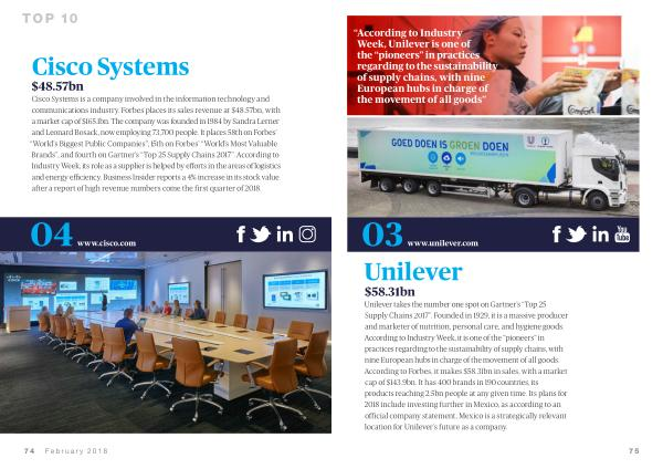 Unilever takes the number one spot on Gartner ’ s “ Top 25 Supply Chains 2017 ”. Founded in 1929 , it is a massive producer and marketer of nutrition , personal care , and hygiene goods . According to Industry Week , it is one of the “ pioneers ” in practices regarding to the sustainability of supply chains , with nine European hubs in charge of the movement of all goods . According to Forbes , it makes $ 58.31bn in sales , with a market cap of $ 143.9bn . It has 400 brands in 190 countries , its products reaching 2.5bn people at any given time . Its plans for 2018 include investing further in Mexico , as according to an official company statement , Mexico is a strategically relevant location for Unilever ’ s future as a company .