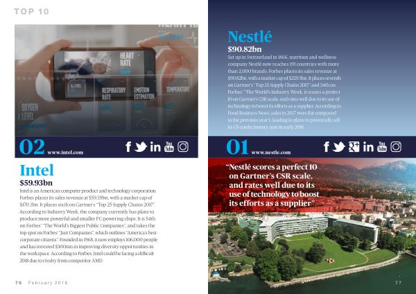 Set up in Switzerland in 1866 , nutrition and wellness company Nestlé now reaches 191 countries with more than 2,000 brands . Forbes places its sales revenue at $ 90.82bn , with a market cap of $ 229.5bn . It places seventh on Gartner ’ s “ Top 25 Supply Chains 2017 ” and 34th on Forbes ’ “ The World ’ s Industry Week , it scores a prefect 10 on Gartner ’ s CSR scale , and rates well due to its use of technology to boost its efforts as a supplier . According to Food Business News , sales in 2017 were flat compared to the previous year ’ s , leading to plans to potentially sell its US confectionary unit in early 2018 .