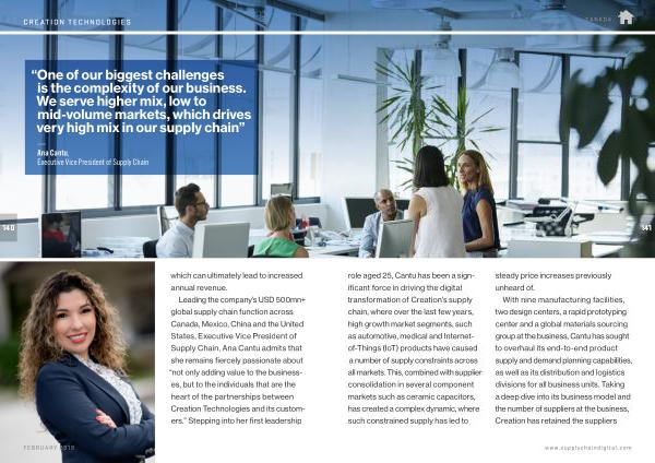 Leading the company ’ s USD 500mn + global supply chain function across Canada , Mexico , China and the United States , Executive Vice President of Supply Chain , Ana Cantu admits that she remains fiercely passionate about “ not only adding value to the businesses , but to the individuals that are the heart of the partnerships between Creation Technologies and its customers .” Stepping into her first leadership