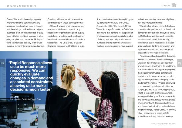 Passionate about upskilling the workforce to counteract these challenges , Creation Technologies succeeds in attracting and developing its workforce , due to its vision of making its employees their customers trusted partner and investing in its team members , moulding them into professional supply chain leaders of the future . “ We are a growing company with great opportunities for our people . We have a strong purpose , which is to enrich lives by sustaining strong profitable growth in an enjoyable and caring culture . I enjoy our fast-paced environment with its many challenges and the opportunity to constantly learning new things ,” notes Cantu . “ However , what I enjoy most is being able to spend time with my team to develop