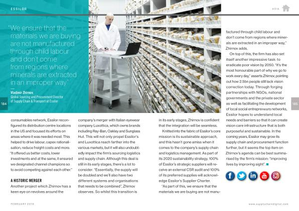 Knitted into the fabric of Essilor ’ s core mission is its sustainable approach , and this hasn ’ t gone amiss when it comes to the company ’ s supply chain and logistics management . As part of its 2020 sustainability strategy , 100 % of Essilor ’ s strategic suppliers will receive an external CSR audit and 100 % of its preferred supplies will acknowledge Essilor ’ s Supplier Charter .