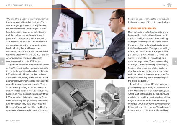 To make this possible LSC is exploring and growing every opportunity . In the summer of 2018 , it took the first step and investing in an AI tech start-up focused on the publishing and media industry , with an eye towards providing target audience data to drive marketing strategies . LSC has also developed a publisherfacing platform called HarvestView designed to increase book discoverability and help