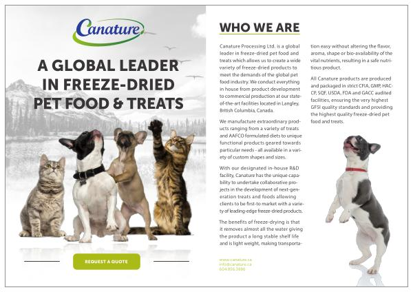 Canature Processing Ltd . is a global leader in freeze-dried pet food and treats which allows us to create a wide variety of freeze-dried products to meet the demands of the global pet food industry . We conduct everything in house from product development to commercial production at our stateof-the-art facilities located in Langley , British Columbia , Canada .