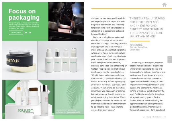 Reflecting on this aspect , Mehrzai credits her varied career experience with providing several skills that are transferable to Golden Hippo ’ s working environment . In particular , she points to two pivotal moments : having the opportunity to build a strong process improvement mindset during her early career , and spending the next years in “ one of the best supply chains in the world ” at Nestle , which she describes as a great training ground . On the former , Mehrzai says that having the opportunity to earn Six Sigma Black Belt certification early in her career