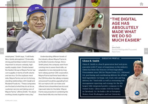 Glenn B . Smith is a fourth generation feed and grain executive with 27 years of experience in the industry . Glenn has been the Director of Feed Ingredient Procurement since 2011 for Wayne Farms LLC , Oakwood , GA , purchasing and coordinating delivery for all bulk feed ingredients via barge , rail , truck , tote and bag delivery for 7 feed mills as well as overseeing risk management reporting and strategy for the 6th largest fully integrated poultry company in the United States . Glenn resides with his family in Cleveland , GA . He holds a BA in European History from Washington and Lee University .