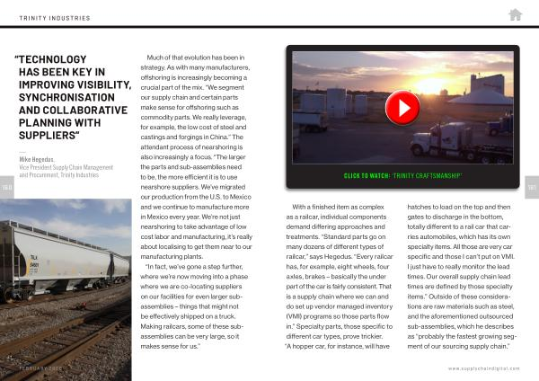 hatches to load on the top and then gates to discharge in the bottom , totally different to a rail car that carries automobiles , which has its own specialty items . All those are very car specific and those I can ’ t put on VMI . I just have to really monitor the lead times . Our overall supply chain lead times are defined by those specialty items .” Outside of these considerations are raw materials such as steel , and the aforementioned outsourced sub-assemblies , which he describes as “ probably the fastest growing segment of our sourcing supply chain .”