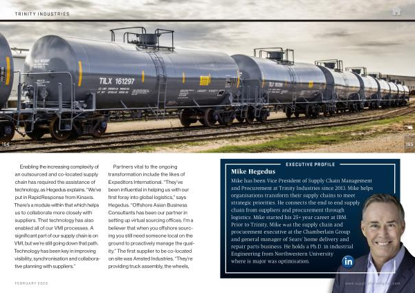 Mike has been Vice President of Supply Chain Management and Procurement at Trinity Industries since 2013 . Mike helps organisations transform their supply chains to meet strategic priorities . He connects the end to end supply chain from suppliers and procurement through logistics . Mike started his 25 + year career at IBM . Prior to Trinity , Mike was the supply chain and procurement executive at the Chamberlain Group and general manager of Sears ’ home delivery and repair parts business . He holds a Ph . D . in industrial Engineering from Northwestern University where is major was optimisation .