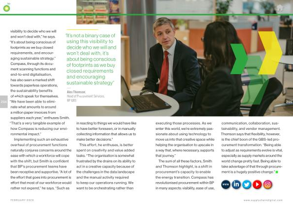 204 visibility to decide who we will and won ’ t deal with ,” he says . “ It ’ s about being conscious of footprints as we buy closed requirements , and encouraging sustainable strategy .” Compass , through its document scanning functions and end-to-end digitalisation , has also seen a marked shift towards paperless operations , the sustainability benefits of which speak for themselves . “ We have been able to eliminate what amounts to around a million paper invoices from suppliers each year ,” enthuses Smith . “ That ’ s a very tangible example of how Compass is reducing our environmental impact .”
