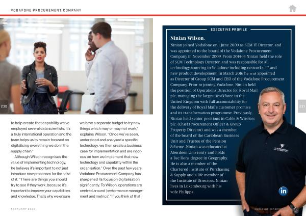 Ninian joined Vodafone on 1 June 2009 as SCM IT Director , and was appointed to the board of the Vodafone Procurement Company in November 2009 . From 2014-16 Ninian held the role of SCM Technology Director , and was responsible for all technology sourcing in Vodafone including networks , IT and new product development . In March 2016 he was appointed as Director of Group SCM and CEO of the Vodafone Procurement Company . Prior to joining Vodafone , Ninian held the position of Operations Director for Royal Mail plc , managing the largest workforce in the United Kingdom with full accountability for the delivery of Royal Mail ’ s customer promise and its transformation programme . Previously , Ninian held senior positions in Cable & Wireless plc . ( Chief Procurement Officer & Group Property Director ) and was a member of the board of the Caribbean Business Unit and Trustee of the Pension Scheme . Ninian was educated at Aberdeen University and holds a Bsc Hons degree in Geography . He is also a member of the Chartered Institute of Purchasing & Supply and a life member of the Institute of Directors . Ninian lives in Luxembourg with his wife Philippa .