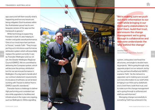 While technology is supporting Transdev ’ s staff , it ’ s also helping to monitor and guide overall performance . “ One of our most important partners is Tracsis ,” reveals Tulitt . “ They ’ re supporting us to introduce a performance attribution system which will essentially replace the system currently in use by Transdev Wellington and our client , the Greater Wellington Regional Council ( GWRC ). We ’ ve committed to delivering the Compass system , which will become the primary attribution tool for our service performance in Wellington . It ’ s a big task to handle all of our contract abatement requirements in one piece of software , so we ’ ve been working with Tracsis to deliver that to GWRC ’ s specific standards .”