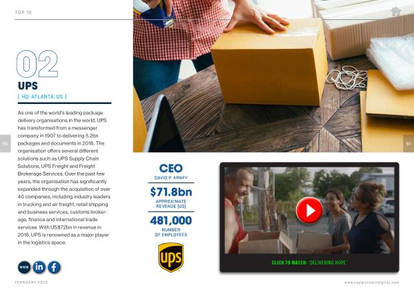 As one of the world ’ s leading package delivery organisations in the world , UPS has transformed from a messenger company in 1907 to delivering 5.2bn packages and documents in 2018 . The organisation offers several different solutions such as UPS Supply Chain Solutions , UPS Freight and Freight Brokerage Services . Over the past few years , the organisation has significantly expanded through the acquisition of over 40 companies , including industry leaders in trucking and air freight , retail shipping and business services , customs brokerage , finance and international trade services . With US $ 72bn in revenue in 2018 , UPS is renowned as a major player in the logistics space .