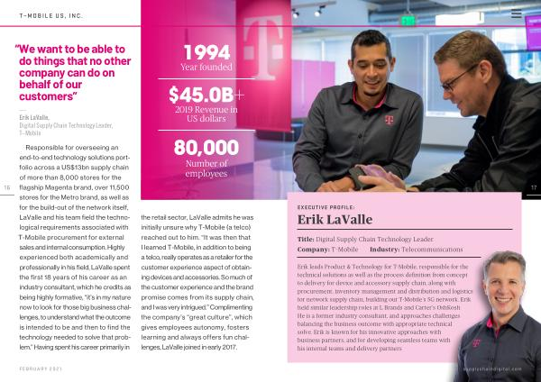 Erik leads Product & Technology for T-Mobile , responsible for the technical solutions as well as the process definition from concept to delivery for device and accessory supply chain , along with procurement , inventory management and distribution and logistics for network supply chain , building out T-Mobile ’ s 5G network . Erik held similar leadership roles at L Brands and Carter ’ s OshKosh . He is a former industry consultant , and approaches challenges balancing the business outcome with appropriate technical solve . Erik is known for his innovative approaches with business partners , and for developing seamless teams with his internal teams and delivery partners supplychaindigital . com