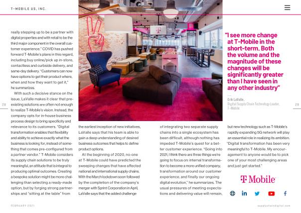29 of integrating two separate supply chains into a single ecosystem has been difficult , although nothing has impeded T-Mobile ’ s quest for a better customer experience . “ Going into 2021 , I think there are three things we ’ re going to focus on : internal transformation to become a more unified company , transformation around our customer experience , and finally our ongoing digital evolution ,” he summarizes . The usual pressures of meeting expectations and delivering value will remain , but new technology such as T-Mobile ’ s rapidly expanding 5G network will play an essential role in realizing its ambition . “ Digital transformation has been very meaningful to T-Mobile . My encouragement to anyone would be to pick one of your most challenging areas and just get started .”