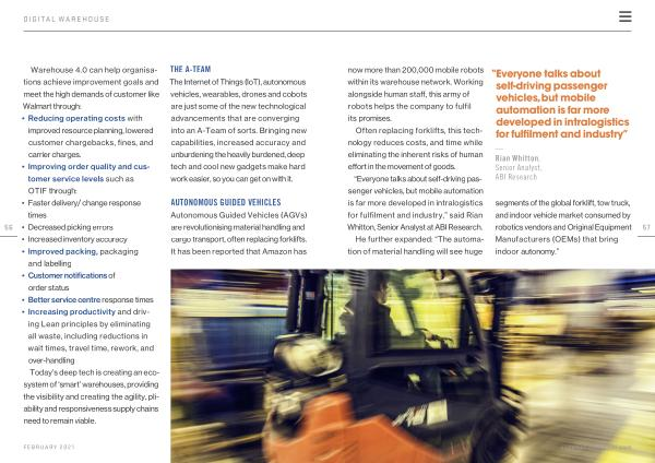 • Increasing productivity and driving Lean principles by eliminating all waste , including reductions in wait times , travel time , rework , and over-handling Today ’ s deep tech is creating an ecosystem of ‘ smart ’ warehouses , providing the visibility and creating the agility , pliability and responsiveness supply chains need to remain viable .