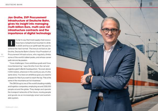 I t ’ s fair to say that most supply chain executives had a metaphorical mountain to climb in 2020 and face an uphill task this year to achieve the ‘ next normal ’. The irony is not lost on Jan Grothe , Deutsche Bahn ’ s Senior Vice President of Procurement Infrastructure , who regularly climbs some of the world ’ s tallest peaks , and whose career path mirrors his passion .