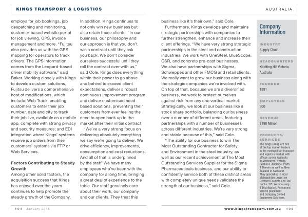 employs for job bookings , job despatching and monitoring , customer-based website portal for job viewing , GPS , invoice management and more . “ Fujitsu also provides us with the GPS mapping for operators to track drivers . The GPS information comes from the Leopard-based driver mobility software ,” said Baker . Working closely with Kings to develop custom solutions , Fujitsu delivers a comprehensive host of modifications , which include : Web Track , enabling customers to enter their job number , date and city to track their job live , available as a mobile app , complete with strong privacy and security measures ; and EDI integration where Kings ’ systems receive job orders from their customers ’ systems via FTP or Web Services .