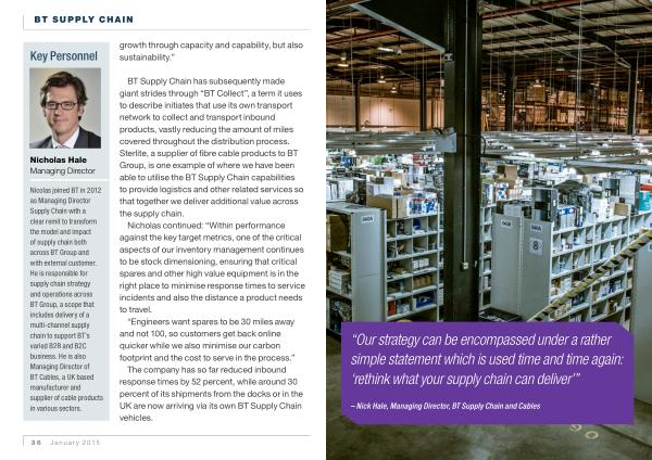 BT Supply Chain has subsequently made giant strides through “ BT Collect ”, a term it uses to describe initiates that use its own transport network to collect and transport inbound products , vastly reducing the amount of miles covered throughout the distribution process . Sterlite , a supplier of fibre cable products to BT Group , is one example of where we have been able to utilise the BT Supply Chain capabilities to provide logistics and other related services so that together we deliver additional value across the supply chain .