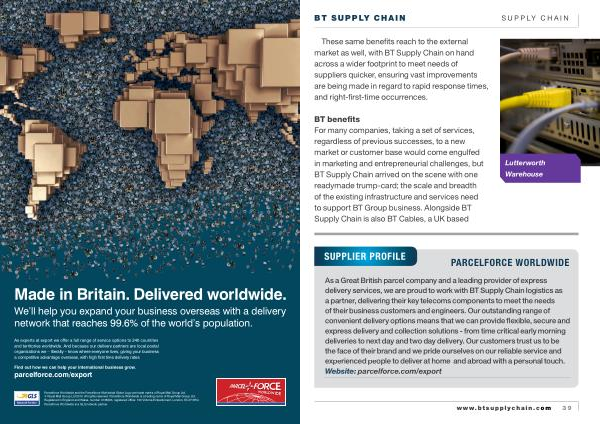 As a Great British parcel company and a leading provider of express delivery services , we are proud to work with BT Supply Chain logistics as a partner , delivering their key telecoms components to meet the needs of their business customers and engineers . Our outstanding range of convenient delivery options means that we can provide flexible , secure and express delivery and collection solutions - from time critical early morning deliveries to next day and two day delivery . Our customers trust us to be the face of their brand and we pride ourselves on our reliable service and experienced people to deliver at home and abroad with a personal touch . Website : parcelforce . com / export www . btsupplychain . com 39
