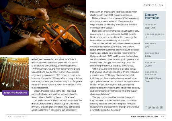 redesigned as needed to make it as efficient , responsive and flexible as possible . Innovation is also key to this strategy , as Hale explained : “ Within London , we are increasingly using public transport and our own feet to move time critical engineering spares and B2C orders around town because it ’ s quicker . We use a hand carry solution because , for example , the best way from Edgware Road to Canary Wharf is not in a small van , it ’ s on the underground .