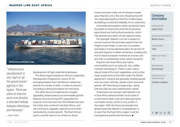 Customers can transact with Maersk Line in East Africa almost entirely via its suite of e-commerce tools , and can make payments via mobile money , which is very prolific in the region . With the financial strength and global expertise Maersk Line possesses , it is clear that the East Africa region is set for a prosperous period into the future .