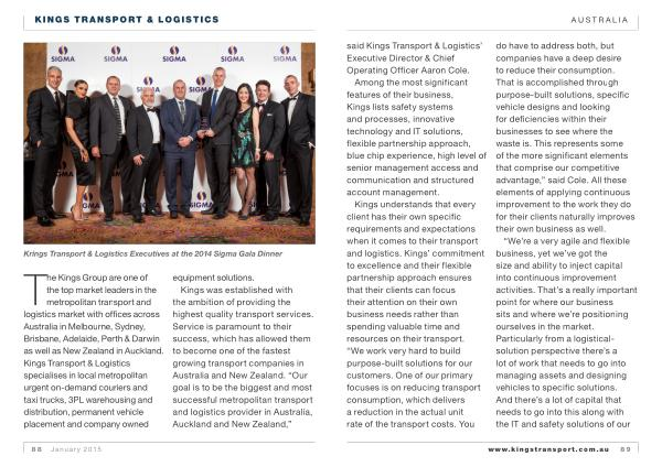 Kings understands that every client has their own specific requirements and expectations when it comes to their transport and logistics . Kings ’ commitment to excellence and their flexible partnership approach ensures that their clients can focus their attention on their own business needs rather than spending valuable time and resources on their transport . “ We work very hard to build purpose-built solutions for our customers . One of our primary focuses is on reducing transport consumption , which delivers a reduction in the actual unit rate of the transport costs . You do have to address both , but companies have a deep desire to reduce their consumption . That is accomplished through purpose-built solutions , specific vehicle designs and looking for deficiencies within their businesses to see where the waste is . This represents some of the more significant elements that comprise our competitive advantage ,” said Cole . All these elements of applying continuous improvement to the work they do for their clients naturally improves their own business as well .