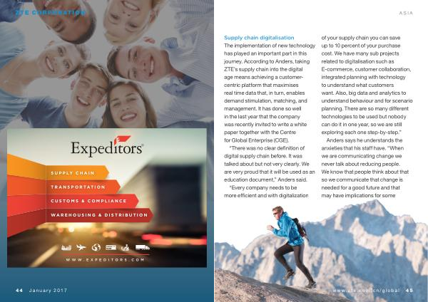 Supply chain digitalisation The implementation of new technology has played an important part in this journey . According to Anders , taking ZTE ’ s supply chain into the digital age means achieving a customercentric platform that maximises real time data that , in turn , enables demand stimulation , matching , and management . It has done so well in the last year that the company was recently invited to write a white paper together with the Centre for Global Enterprise ( CGE ).