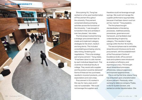 Since joining VU , Tiong has worked on a five-year transformation of Procurement throughout the university . Procurement comprised siloed purchasing activities across the functions of the University . “ I was brought in to transform that and centralise it over two phases ,” she notes .