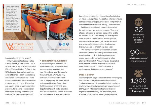 FOOD AND DRINK taking into consideration the number of outlets that we have , so this puts us in a position where we have a competitive advantage over the other competitors in the market to receive better pricing ,” Nasr remarks . AWJ Investments is well known in the market for having a very transparent strategy . “ Economy of scale allows us to be more competitive and to be ahead in the market . Having our own logistics team where we cater to all our outlets gives us the responsibility of getting all the items to each and every outlet , based on their timelines , so this is what puts us ahead ,” explains Nasr .