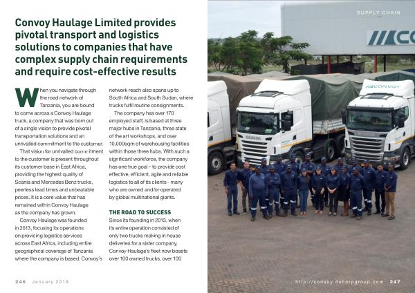 Convoy Haulage was founded in 2013 , focusing its operations on providing logistics services across East Africa , including entire geographical coverage of Tanzania where the company is based . Convoy ’ s network reach also spans up to South Africa and South Sudan , where trucks fulfil routine consignments .