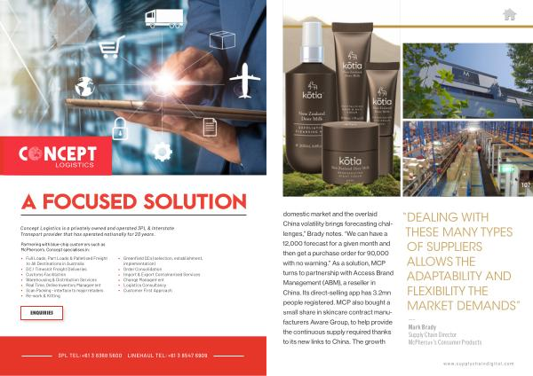 107 domestic market and the overlaid China volatility brings forecasting challenges ,” Brady notes . “ We can have a 12,000 forecast for a given month and then get a purchase order for 90,000 with no warning .” As a solution , MCP turns to partnership with Access Brand Management ( ABM ), a reseller in China . Its direct-selling app has 3.2mn people registered . MCP also bought a small share in skincare contract manufacturers Aware Group , to help provide the continuous supply required thanks to its new links to China . The growth
