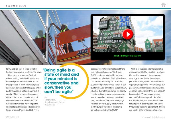 CLICK TO WATCH : ‘ THE OCS WAY ’ 117 approach is not sustainable and therefore not good business .” With over 2,000 customers in the UK and each using its supply chain , Caddell believes procurement is vitally important for overall company success . “ Each of our customers use part of our supply chain , whether that ’ s the machines we deploy on-site , uniforms given to our employees or materials cleaning operatives use ,” he affirms . “ We have a very high reliance on our supply chain , which is why our procurement function is so well regarded within OCS .”