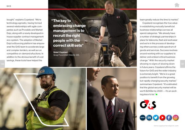 136 bought ,” explains Copeland . “ We ’ re technology agnostic , having formed several relationships with agile companies such as Provalido and Market Dojo , along with a newly developed inhouse supplier contract management eco-system . The adoption of Market Dojo ’ s eSourcing platform has empowered the G4S team to accelerate large and complex tenders , as well as run competitive on-demand eAuctions . In addition to the obvious benefit of cost savings , these tools have helped the