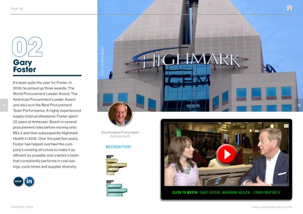 It ’ s been quite the year for Foster . In 2019 , he picked up three awards : The World Procurement Leader Award , The Americas Procurement Leader Award and also won the Best Procurement Team Performance . A highly experienced supply chain professional , Foster spent 22 years at Anheuser-Busch in several procurement roles before moving onto RELX and then subsequently Highmark Health in 2016 . Over the past few years , Foster has helped overhaul the company ’ s existing structure to make it as efficient as possible and created a team that consistently performs in cost savings , cycle times and supplier diversity .