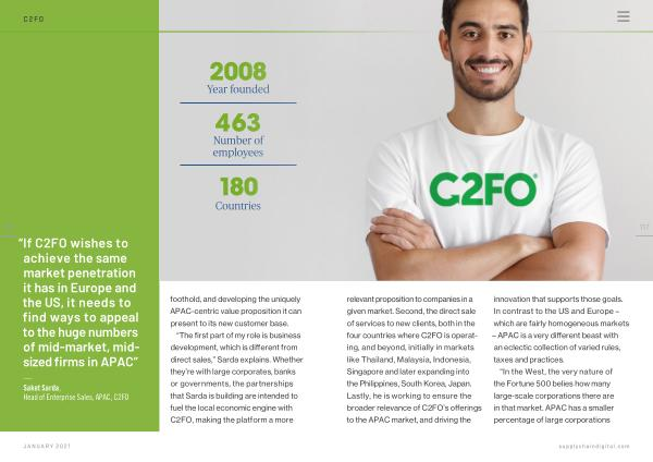 117 relevant proposition to companies in a given market . Second , the direct sale of services to new clients , both in the four countries where C2FO is operating , and beyond , initially in markets like Thailand , Malaysia , Indonesia , Singapore and later expanding into the Philippines , South Korea , Japan . Lastly , he is working to ensure the broader relevance of C2FO ’ s offerings to the APAC market , and driving the innovation that supports those goals . In contrast to the US and Europe – which are fairly homogeneous markets – APAC is a very different beast with an eclectic collection of varied rules , taxes and practices .