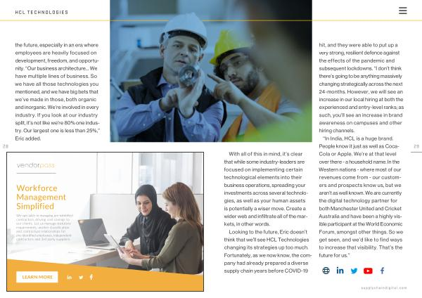 28 the future , especially in an era where employees are heavily focused on development , freedom , and opportunity . “ Our business architecture ... We have multiple lines of business . So we have all those technologies you mentioned , and we have big bets that we ’ ve made in those , both organic and inorganic . We ’ re involved in every industry . If you look at our industry split , it ’ s not like we ’ re 80 % one industry . Our largest one is less than 25 %,” Eric added .