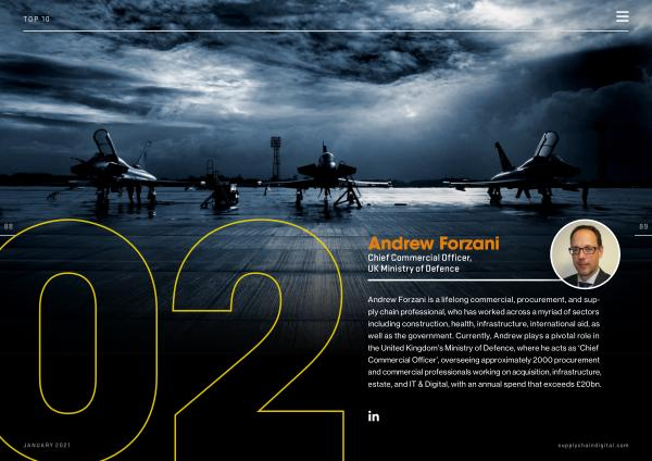 Andrew Forzani is a lifelong commercial , procurement , and supply chain professional , who has worked across a myriad of sectors including construction , health , infrastructure , international aid , as well as the government . Currently , Andrew plays a pivotal role in the United Kingdom ’ s Ministry of Defence , where he acts as ‘ Chief Commercial Officer ’, overseeing approximately 2000 procurement and commercial professionals working on acquisition , infrastructure , estate , and IT & Digital , with an annual spend that exceeds £ 20bn .