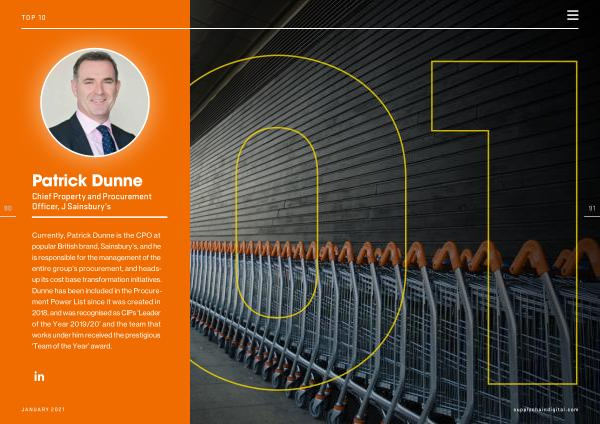 Currently , Patrick Dunne is the CPO at popular British brand , Sainsbury ’ s , and he is responsible for the management of the entire group ’ s procurement , and headsup its cost base transformation initiatives . Dunne has been included in the Procurement Power List since it was created in 2018 , and was recognised as CIPs ‘ Leader of the Year 2019 / 20 ’ and the team that works under him received the prestigious ‘ Team of the Year ’ award . JANUARY 2021