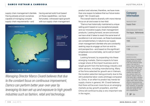 Damco Vietnam & Cambodia manages and serves some of the most advanced supply chains in the world for a diverse range of industries . For more than 100 years , Damco has provided customers with transportation and logistics solutions that support the way customers want to do business , wherever they are in the world . With a relentless focus on simplifying complex supply chains , Damco uncovers efficiency improvements that enable our customers to reduce their inventories , cut operating costs , and achieve significant short-term savings for longterm competitiveness . www . damco . com / 103