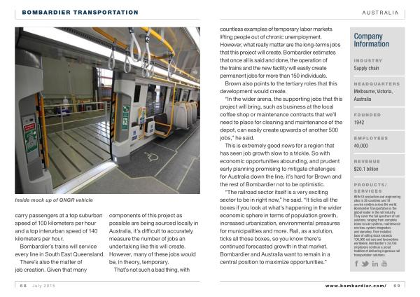 “ The railroad sector itself is a very exciting sector to be in right now ,” he said . “ It ticks all the boxes if you look at what ’ s happening in the wider economic sphere in terms of population growth , increased urbanization , environmental pressures for municipalities and more . Rail , as a solution , ticks all those boxes , so you know there ’ s continued forecasted growth in that market . Bombardier and Australia want to remain in a central position to maximize opportunities .”