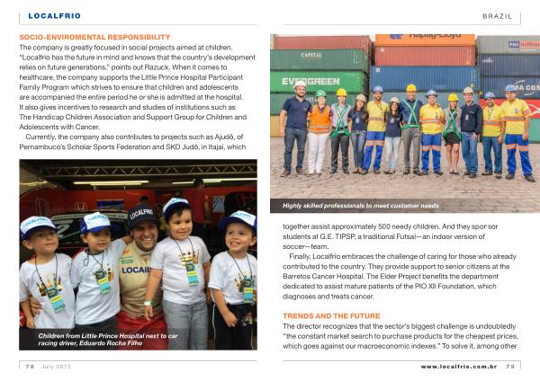 SOCIO-ENVIROMENTAL RESPONSIBILITY The company is greatly focused in social projects aimed at children . “ Localfrio has the future in mind and knows that the country ’ s development relies on future generations ,” points out Razuck . When it comes to healthcare , the company supports the Little Prince Hospital Participant Family Program which strives to ensure that children and adolescents are accompanied the entire period he or she is admitted at the hospital . It also gives incentives to research and studies of institutions such as The Handicap Children Association and Support Group for Children and Adolescents with Cancer .