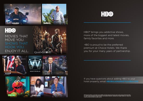 HBO is proud to be the preferred premium at Choice Hotels . We thank you for your many years of partnership .