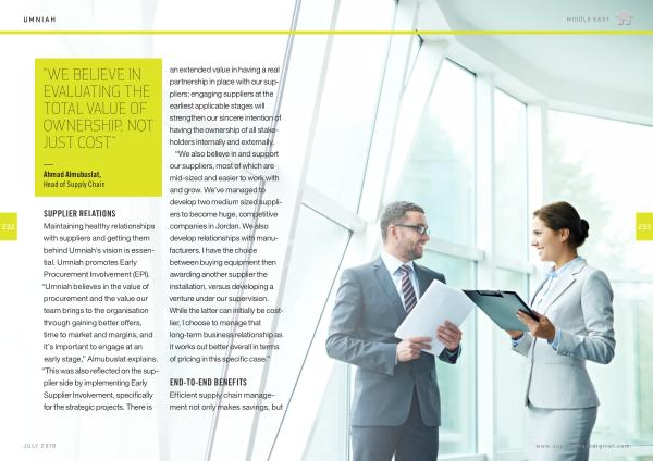 Maintaining healthy relationships with suppliers and getting them behind Umniah ’ s vision is essential . Umniah promotes Early Procurement Involvement ( EPI ). “ Umniah believes in the value of procurement and the value our team brings to the organisation through gaining better offers , time to market and margins , and it ’ s important to engage at an early stage ,” Almubuslat explains . “ This was also reflected on the supplier side by implementing Early Supplier Involvement , specifically for the strategic projects . There is an extended value in having a real partnership in place with our suppliers : engaging suppliers at the earliest applicable stages will strengthen our sincere intention of having the ownership of all stakeholders internally and externally . “ We also believe in and support our suppliers , most of which are mid-sized and easier to work with and grow . We ’ ve managed to develop two medium sized suppliers to become huge , competitive companies in Jordan . We also develop relationships with manufacturers . I have the choice between buying equipment then awarding another supplier the installation , versus developing a venture under our supervision . While the latter can initially be costlier , I choose to manage that long-term business relationship as it works out better overall in terms of pricing in this specific case .”