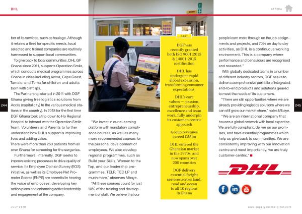 The Partnership started in 2011 with DGF Ghana giving free logistics solutions from Accra ( capital city ) to the various medical stations in the country ). In 2018 for the first time DGF Ghana took a trip down to Ho Regional Hospital to interact with the Operation Smile Team , Volunteers and Parents to further understand how DHL ’ s support is improving lives and adding value . There were more than 250 patients from all over Ghana for screening for the surgeries . Furthermore , internally , DGF seeks to improve existing processes to drive quality of service . Its Employee Opinion Survey ( EOS ) initiative , as well as its Employee Net Promoter Scores ( ENPS ) are essential in hearing the voice of employees , developing key action plans and enhancing active leadership and engagement at the company .