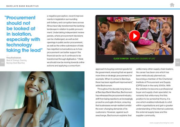 — Vinay Bachoonum , Head of Strategic Sourcing Barclays Bank Mauritius a negative perception , recent improvements in legislation surrounding anti-bribery and corruption laws across Africa have fully transformed the banking landscape in relation to public procurement . Undertaking independent review panels , where procurement decisions can be challenged , as well as bid openings in public sector procurement , as well as the online submission of bids has reignited conversations as to how procurement can better support the financial sector as it continues to be transformed through digitisation . “ I think we should now be moving towards online actions and applying a consortium
