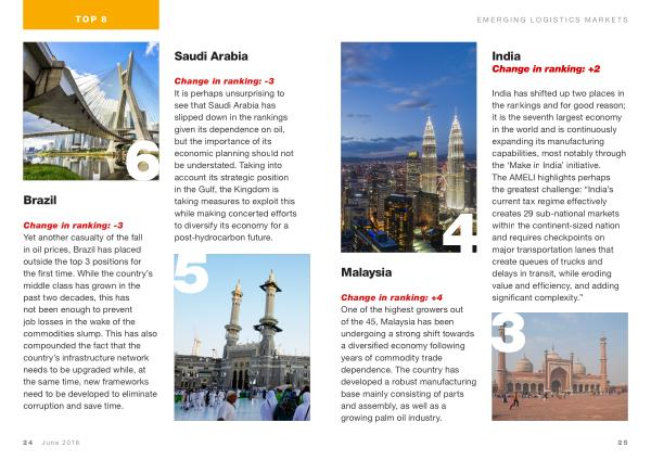 India has shifted up two places in the rankings and for good reason ; it is the seventh largest economy in the world and is continuously expanding its manufacturing capabilities , most notably through the ‘ Make in India ’ initiative . The AMELI highlights perhaps the greatest challenge : “ India ’ s current tax regime effectively creates 29 sub-national markets within the continent-sized nation and requires checkpoints on major transportation lanes that create queues of trucks and delays in transit , while eroding value and efficiency , and adding significant complexity .”