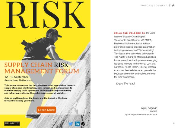 EDITOR ’ S COMMENT HELLO AND WELCOME TO the June issue of Supply Chain Digital . This month , Neil Kinson , VP EMEA , Redwood Software , looks at how enterprise robotic process automation is driving a new era of ‘ Cybershoring ’. This issue also uses data collected in The Agility Emerging Markets Logistics Index to explore the top seven emerging logistics markets in the world . Last but not least , Niklas Hedin , CEO of Centiro examines how retailers can provide the best possible click and collect service for their customers .