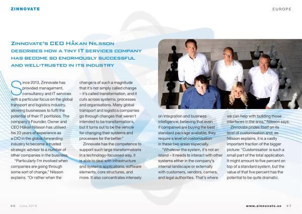 Since 2013 , Zinnovate has provided management , consultancy and IT services with a particular focus on the global transport and logistics industry , allowing businesses to fulfil the potential of their IT portfolios . The company ’ s Founder , Owner and CEO Håkan Nilsson has utilised his 23 years of experience as a CIO in the global forwarding industry to become a trusted strategic advisor to a number of other companies in the business .
