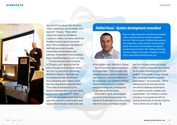 “ I ’ ve developed a lot of contacts in 23 years , and I approached the ones I thought to be the best , which are now my partners in Zinnovate . WiseTech Global in Australia is a successful provider of software , and partnering with it allows me to tap into a big global customer base . They have an extreme focus on product development , but how could customers make use of it ? That ’ s where we can come in and close that gap with a level of customisation and support that actually makes best use