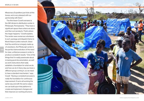 The third team Covell oversees is the GIK division ’ s distribution center in Pittsburgh , Pennsylvania . “ They have a significant space there where we store and then sort products . That ’ s where the magic happens ,” Covell explains . The center uses numerous volunteers to sort , package and dispatch items to World Vision ’ s entire network . Given that the workforce is largely made up of volunteers , the Pittsburgh center is the perfect demonstration of the need for clear , unified processes in order to produce consistent results . “ One of the things that I ’ m really passionate about is having good documentation , as well as work instructions that really establish a foundation for what we do and how we do it . Every day you have a different group coming in , so we need to have a standard mechanism ,” says Covell . “ Having a consistent process is really the foundation for continuous improvement . If we ’ re all working the same way and with the same output , we can build upon that platform to create and implement changes and then improve our working structure ;